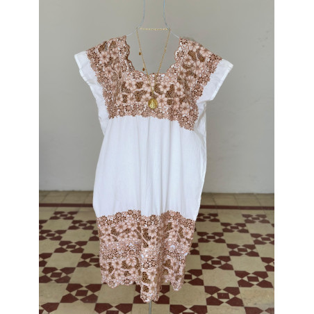 Hipil de tela de algodón bordado de renacimiento color café. Largo: 109 cm, Ancho: 68 cm.