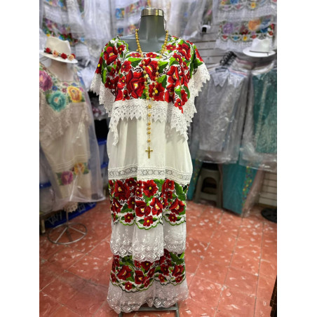 Terno de tela de algodón con solapa bordado de color rojo vivo con follaje verde, encaje inglés en solapa. Largo: 150 cm, Ancho: 62 cm.