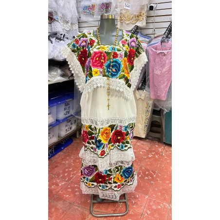 Terno de tela de algodón con bordado matizado, encaje inglés en solapa. Largo: 150 cm, Ancho: 62 cm.